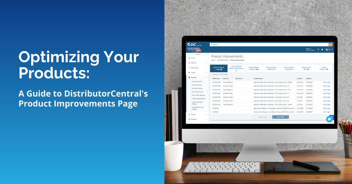 DistributorCentral's Product Improvements page streamlines your product listings by highlighting the key elements that require your focus. Ensuring that each product is equipped with essential features such as images, bullet points, and keywords is crucial for optimal visibility and discoverability within the DistributorCentral product database.